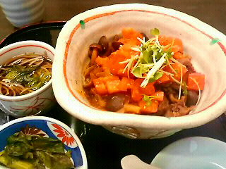 すき焼きみたいなのの上に、トマトが乗ったどんぶり。